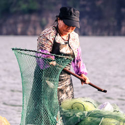 Some 125 miles north from Jinghong I reach Nuo Zha Du, the second-largest dam on the river. An old fisherman in a relocated village on a treeless slope descending to the dam explains how a small fishing industry has sprung up. Businesspeople from far away are attracted by the introduction of new species of fish into the dam’s reservoir. Most of the native fish are gone now, the fisherman says.