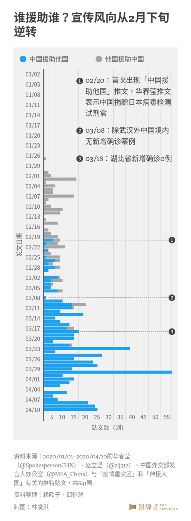 2月13日,湖北省的新增确诊人数从前一日的14,840人,骤减至4,823人,全中国每日新增病例也从这天开始一路下滑。约一周后,中国外交部发言人的推文风向开始慢慢转变,从感谢他国援助的“疫情重灾区”,转为可以输出物资与经验的“伸援大国”。