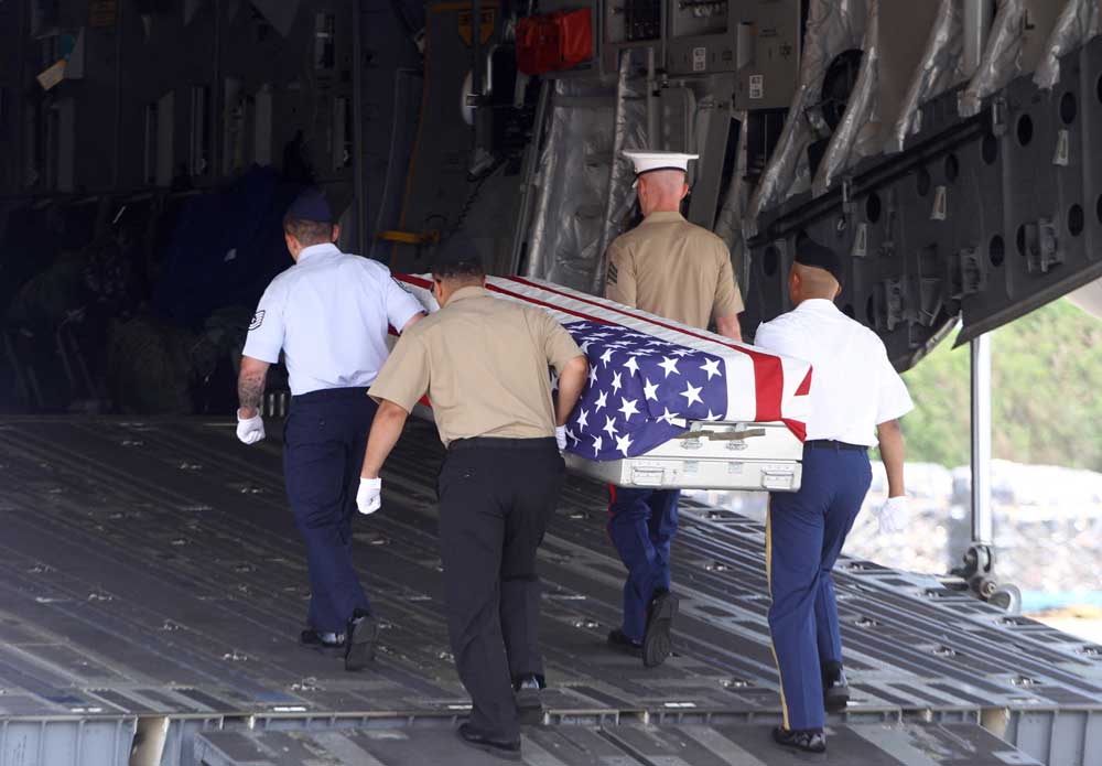 Một xe ngựa chở quan tài chứa hài cốt của bốn người lính Mỹ đã mất tích trong Chiến tranh Việt Nam đến Nghĩa trang Quốc gia Arlington ở Virginia, Hoa kỳ ngày 17/6/2015. Photo: AP